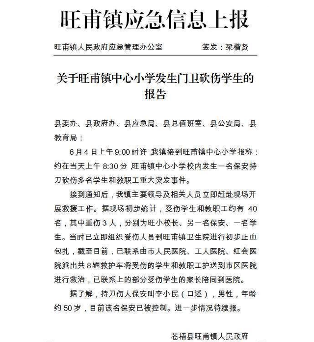 一名知情人士此前给予的一份《旺甫镇应急信息上报材料》显示,经初步统计,受伤学生和教职工约有40人,其中重伤3人,分别为旺小校长、另一名保安一名学生。持刀伤人李某某,男性,约50岁。